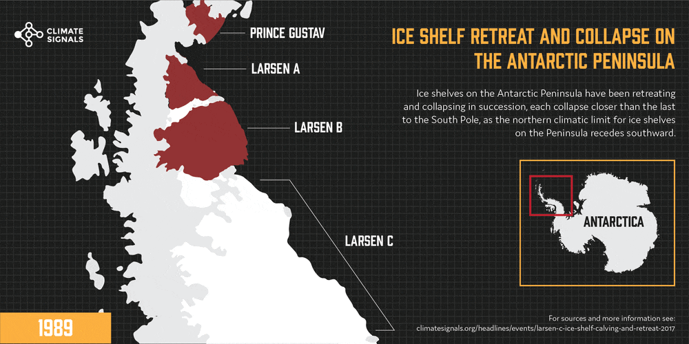 Whilst calving is a natural thing, it has become more studied in recent decades because of its potential links to climate change and global warming. As the adverts with sad polar bears suggest, more and larger icebergs are calving as a result of increased ice melting at earth's poles. And their melting into the oceans is contributing to sea level rise that threatens many major world cities on the coasts. Hence, when scientists noticed several fractures across the four sections which make up the Larsen Ice Shelf on the Eastern edge of Antarctica, they presented a cause for concern.